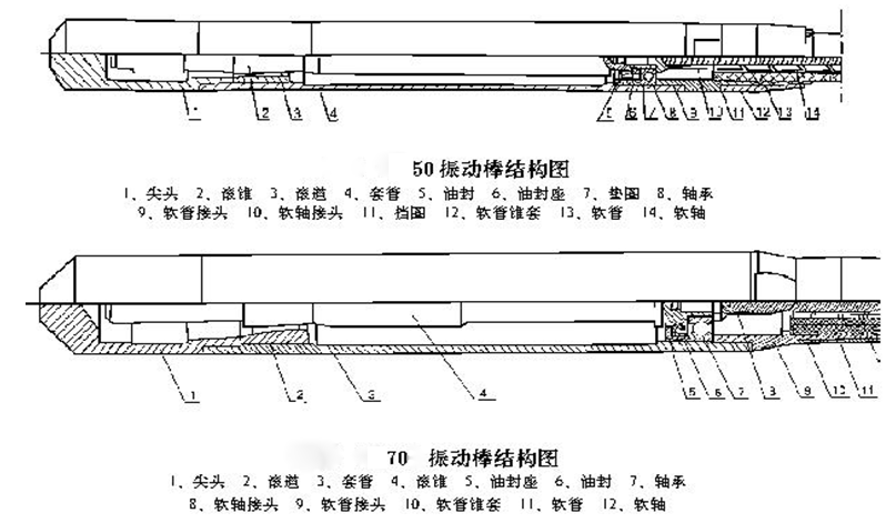 2、动力从软轴传递到棒头:动力到达软轴之后,软轴与软轴接头压紧一起带动滚锥,由于滚锥的一端支撑在大间隙轴承上,另一端沿滚道滚动,偏心旋转的滚锥所产生的离心力通过滚道作用于振动棒上。依据行星增速原理,振动棒获得200Hz左右的*频圆周振动。